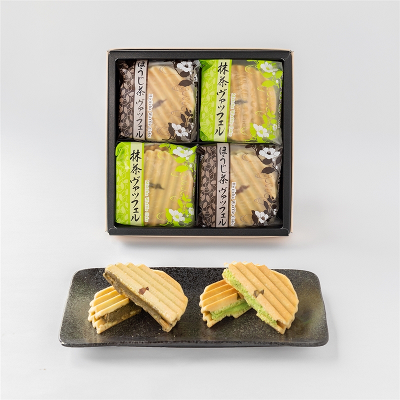 サクサクの波型クッキーに 風味豊かな宇治抹茶のクリームをサンドした抹茶ヴァッフェルと、 香ばしい豊かな香りのほうじ茶のクリームをサンドしたほうじ茶ヴァッフェル。