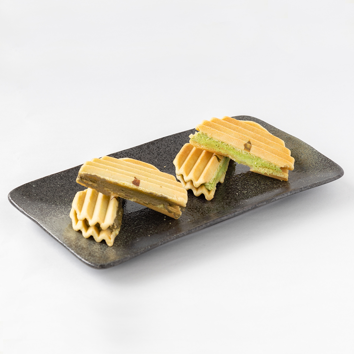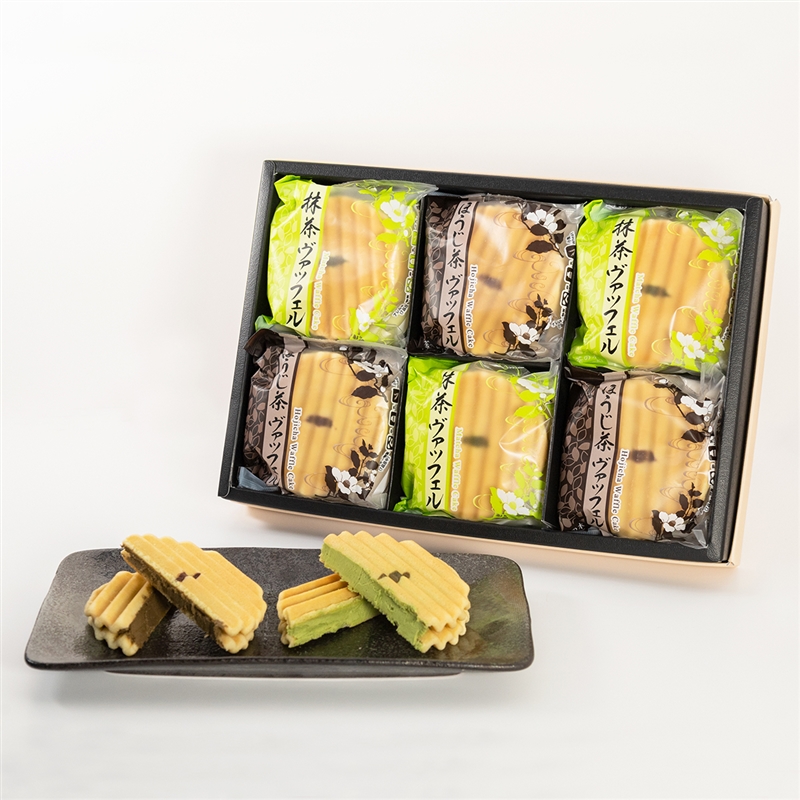 サクサクの波型クッキーに 風味豊かな宇治抹茶のクリームをサンドした抹茶ヴァッフェルと 香ばしい豊かな香りのほうじ茶のクリームをサンドしたほうじ茶ヴァッフェル。