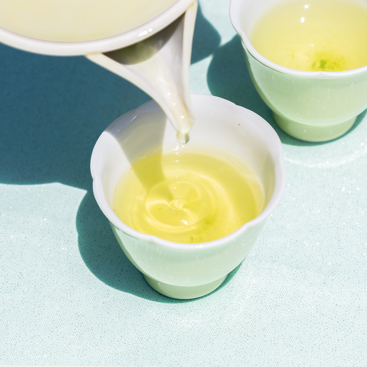 3. 煎茶八十八金は約1分半、鹿児島新茶若葉の風は約1分おいて、最後の一滴まで残さず注ぎきってください。