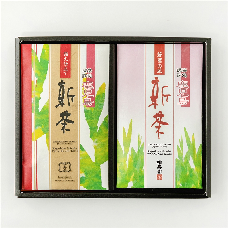 こちらは、当社で販売している鹿児島新茶シリーズの中から、ほのかな旨味の「若葉の風」と、従来の新茶よりも香ばしい風味の「強火仕立て」をお詰めしたギフトセットです。