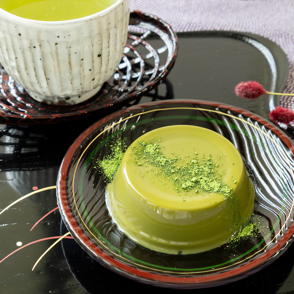 舌の上でとろけるなめらかな口当たりのプリンは、お茶やラテなどの飲み物との相性もばっちりです。 お好みで、別添の緑鮮やかな宇治抹茶パウダーを振りかけてお召し上がりください。
