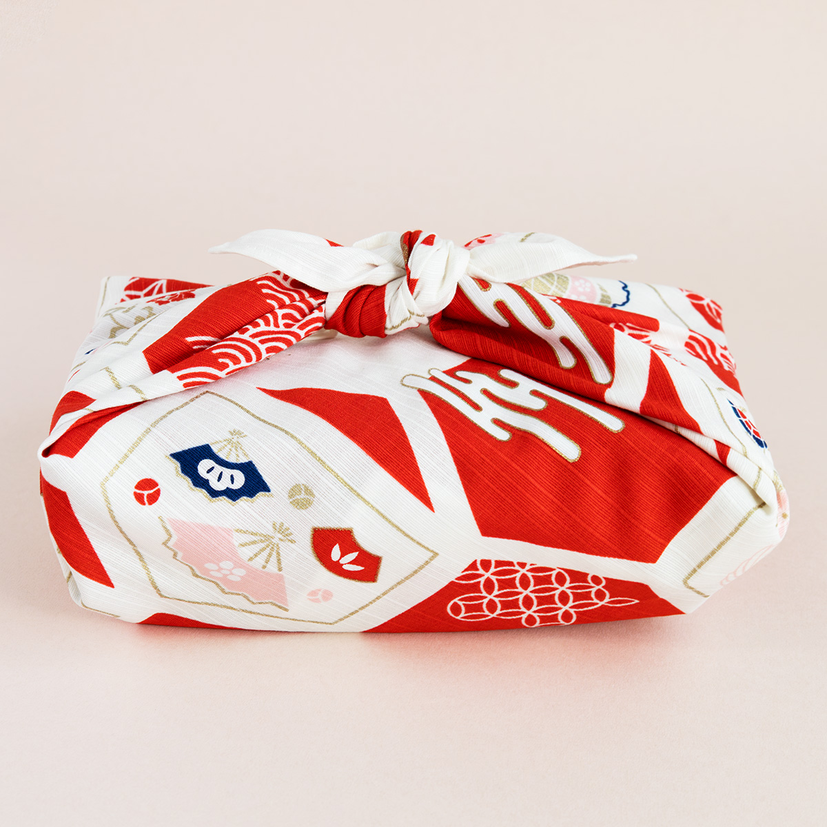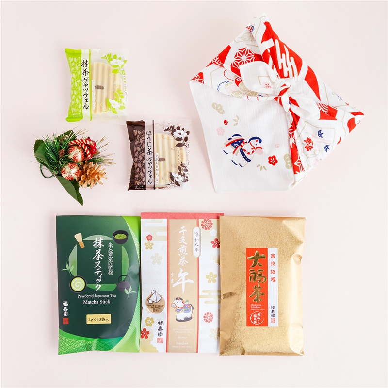 2026年の干支「午」と縁起モチーフをあしらった小風呂敷(48㎝×48㎝)でお包みした、オンラインショップ限定のギフトセットです。