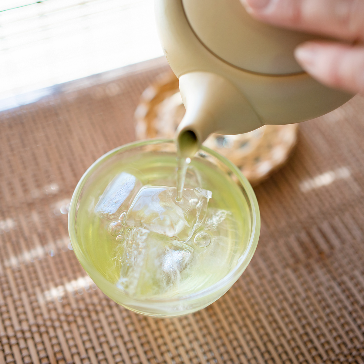また、氷を敷き詰めたグラスに、濃い目にお淹れしたお茶を注いでいただいても、美味しくお召し上がりいただけます。ほっとひと息つきたい時に、ぜひお試しください。