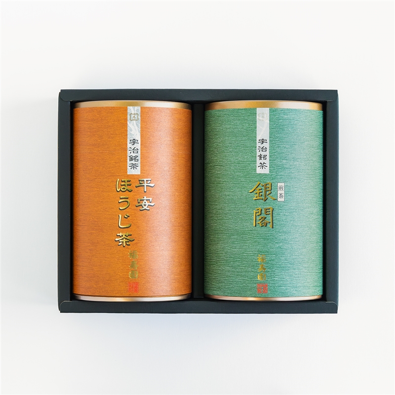 程よく旨味と渋味が調和した清涼感のある煎茶「銀閣」と、良質の煎茶をほうじたかんばしい香りと後味のよい「平安ほうじ茶」のセットです。
